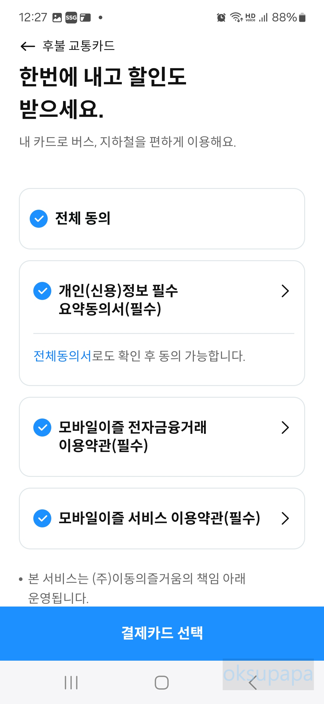 카드 선택 및 등록: [카드 등록] 메뉴에서 교통카드를 선택합니다. 티머니 또는 캐시비와 같은 교통카드 옵션 중 하나를 선