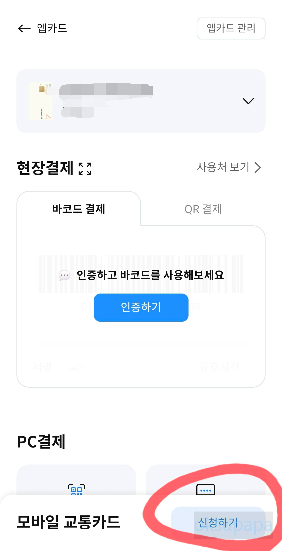 카드 선택 및 등록: [카드 등록] 메뉴에서 교통카드를 선택합니다. 티머니 또는 캐시비와 같은 교통카드 옵션 중 하나를 선