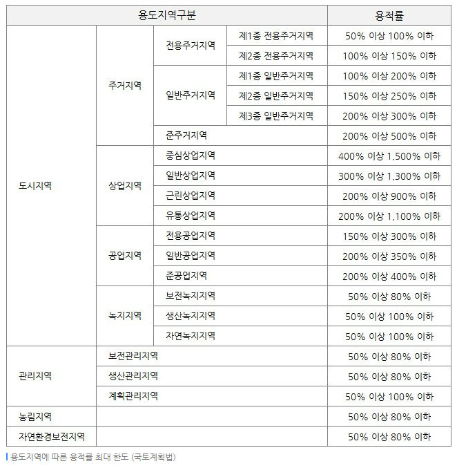 - 예: 대지 면적이 500㎡이고 건물 연면적이 1,000㎡라면, 용적률은 200%입니다.