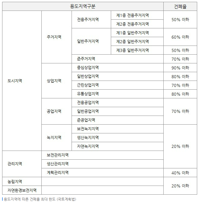 - 예: 대지 면적이 500㎡이고 건물의 1층 바닥 면적이 250㎡라면, 건폐율은 50%입니다.