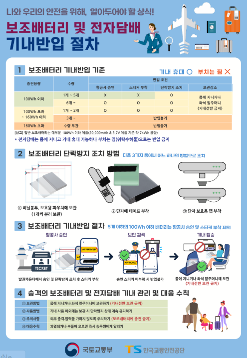 국토교통부는 항공기 내 화재 사고를 예방하고 승객 안전을 확보하기 위해 보조배터리 및 전자담배의 기내 반입 및 보관 규정을 강화하는 새로운 표준안을 마련하고, 2025년 3월 1일부터 시행할 예정입니다. 이에 따라 승객들은 기내 반입 가능 용량·수량 제한, 승인 절차, 단락방지 조치, 보관 방법 등의 지침을 준수해야 합니다.