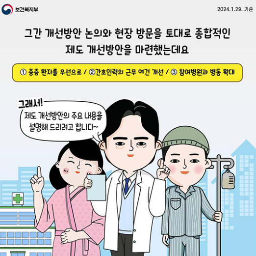 하루 10만 원이 넘는 간병비 부담을 줄이고, 환자는 보다 전문적인 간호를 받을 수 있으며, 보호자는 간병비 문제로 삶이 무너지지 않도록 지원하는 것이 이 제도의 핵심 목표입니다.