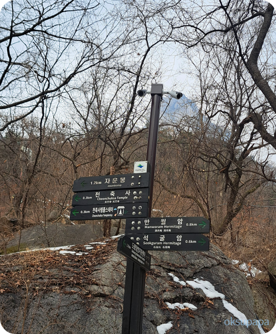 하산은 같은 길로 돌아오거나, 자운봉(739.5m)과 연계하여 하산하는 방법이 있습니다.