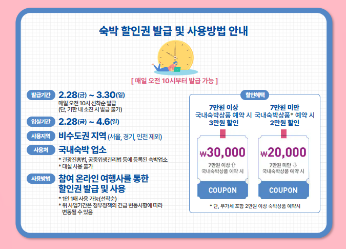 이번 행사는 국내 여행 활성화를 위해 마련된 대규모 숙박 할인 이벤트로, 총 100만 장의 숙박 할인권이 배포될 예정입니다.