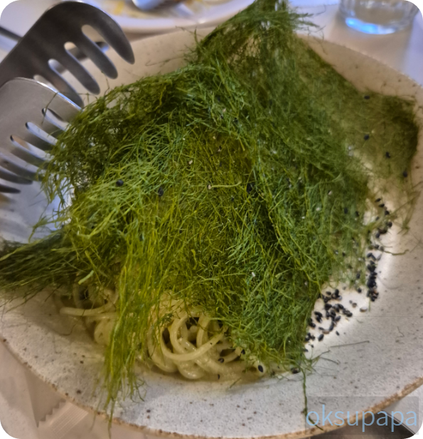 • 무수막 감태 들기름 파스타: 감태와 들기름의 조화가 돋보이는 콜드 파스타로, 파스타면이 독특하며, 고소하면서도 담백한 맛이었다.
