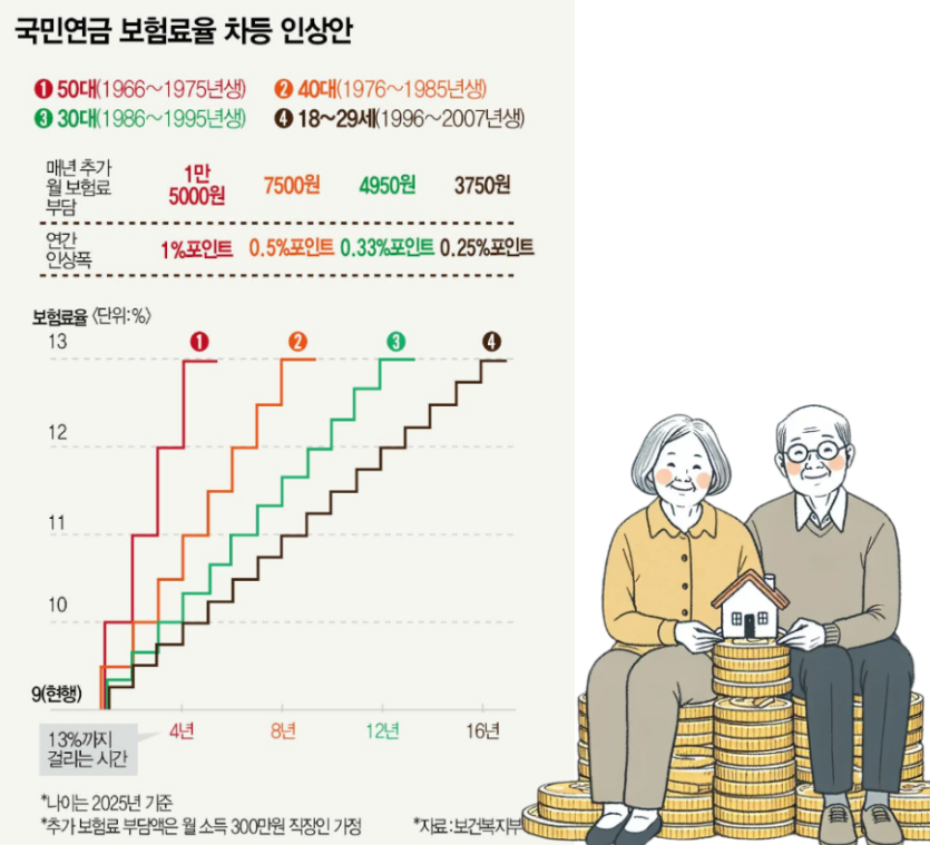 국민연금 보험료율이 현재 9%에서 13%로 인상됩니다.