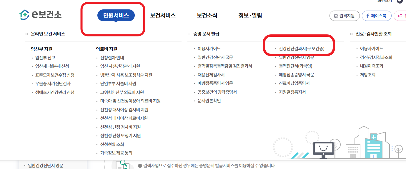 - 메인 화면에서 '건강진단결과서 발급' 또는 '보건증 발급' 메뉴 클릭