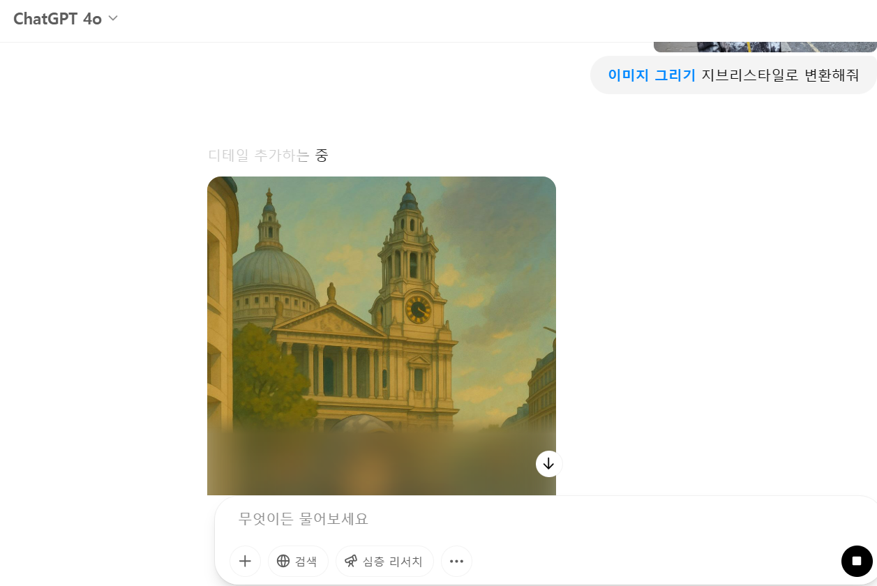 - ChatGPT에 사진 업로드 + "지브리 스타일로 바꿔줘" 요청