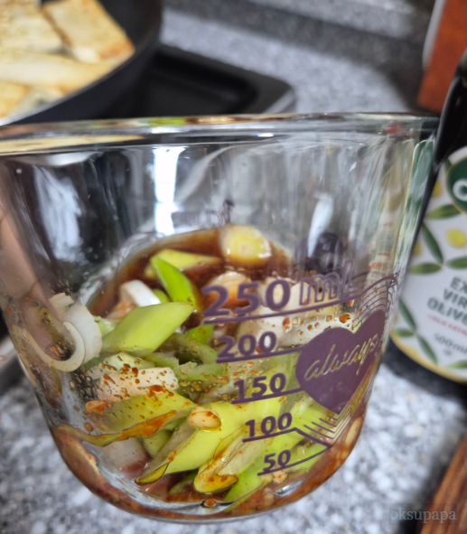 그릇에 양념장 재료를 넣고 (진간장, 고춧가루, 다진 마늘, 설탕, 굴소그, 물, 참기름) 잘 섞어 양념장을 만들어주세요.