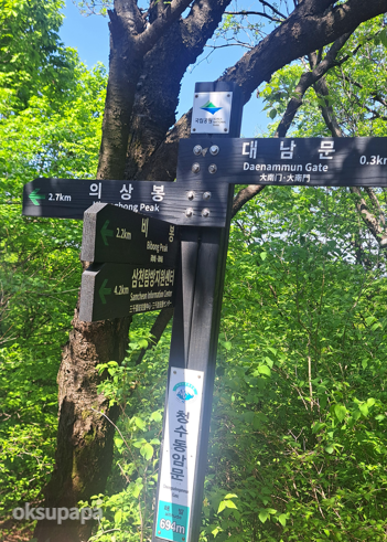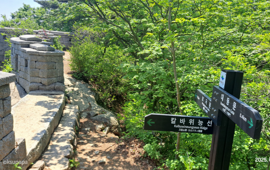 암릉과 숲길이 번갈아 나오며, 대동문까지는 비교적 완만한 오르막이 계속됩니다.