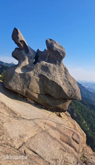 북한산 주요 봉우리 중 하나로, 깎아지른 듯한 바위 봉우리와 탁 트인 조망이 일품입니다. 이곳에서 의상능선으로의 진입은 주의 요망입니다.