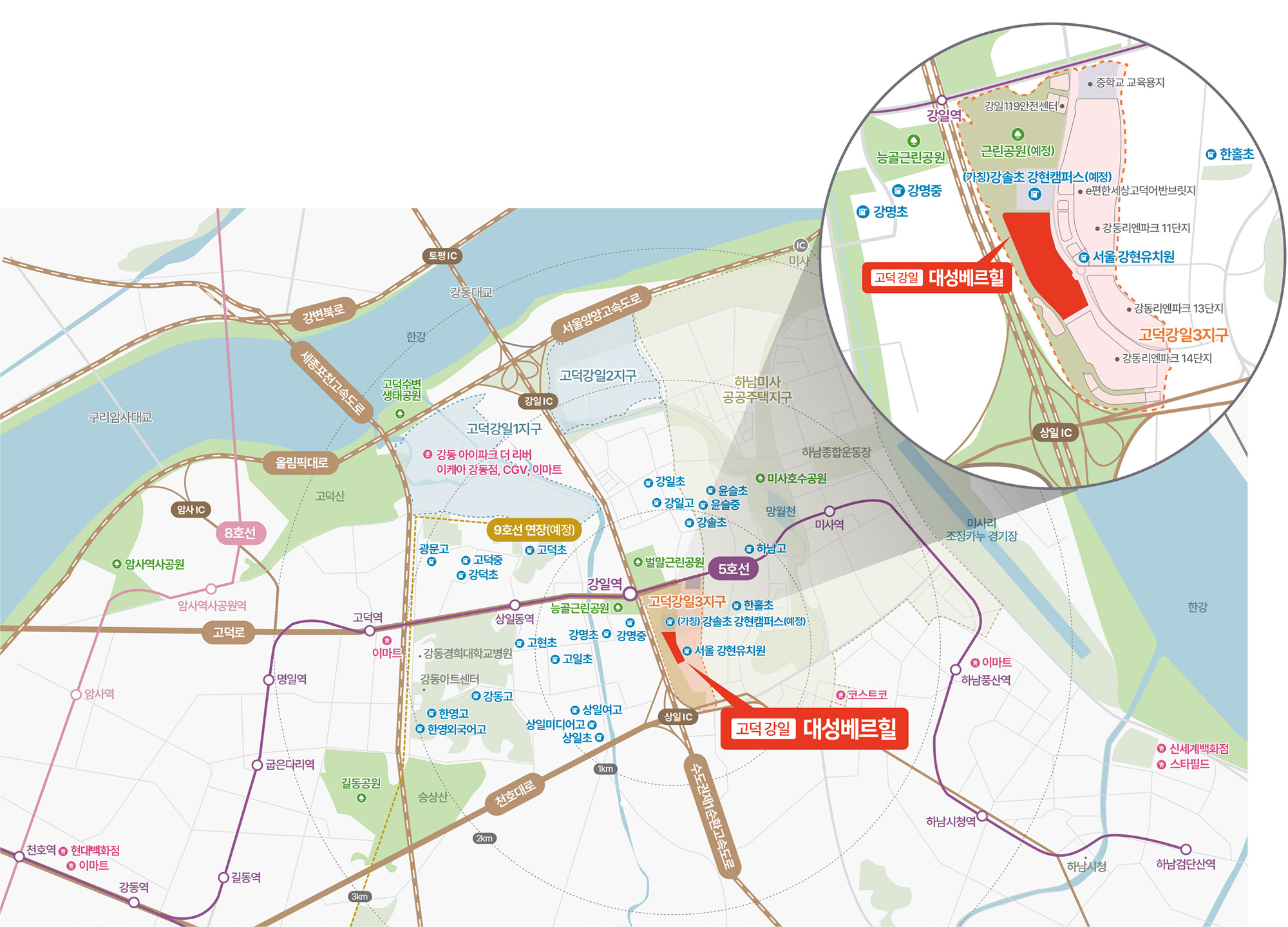 - 강솔초 강현캠퍼스(가칭, 2029년 개교 예정), 강명초·중, 강일고, 한영외고, 배재고 등 우수 학군 밀집