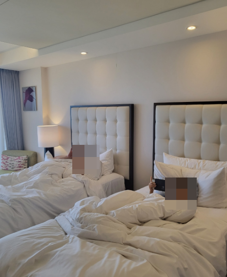 너무 편안한 호텔 침대 덕분에 아들과 아빠는 침대에서 나올 생각이 없었다...^^