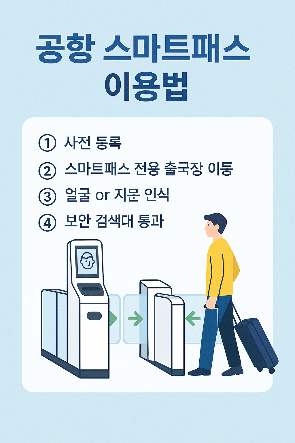 스마트패스는 사전 등록된 생체정보(지문·얼굴)를 활용해 탑승수속과 보안검색을 빠르게 통과할 수 있도록 도와주는 제도예요.