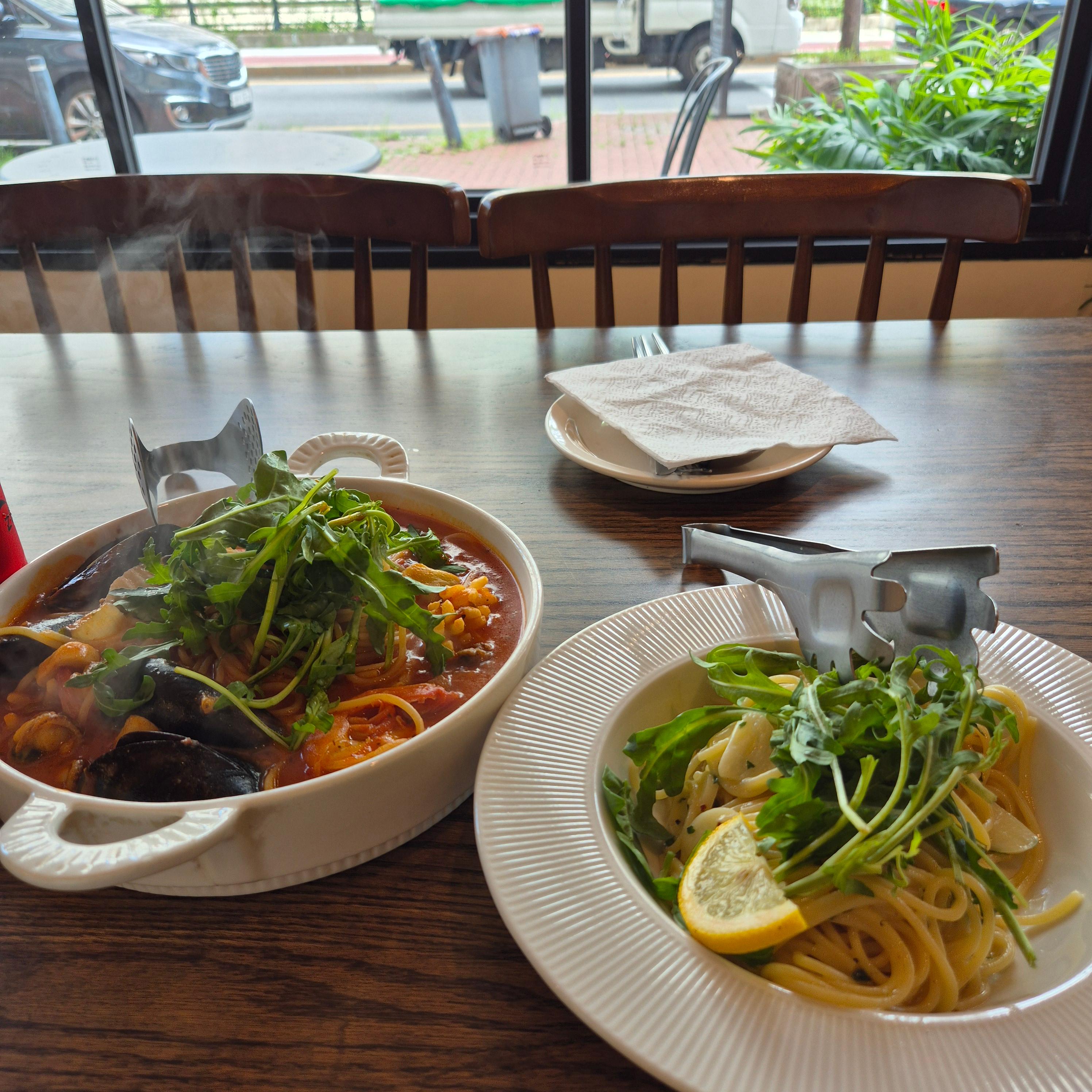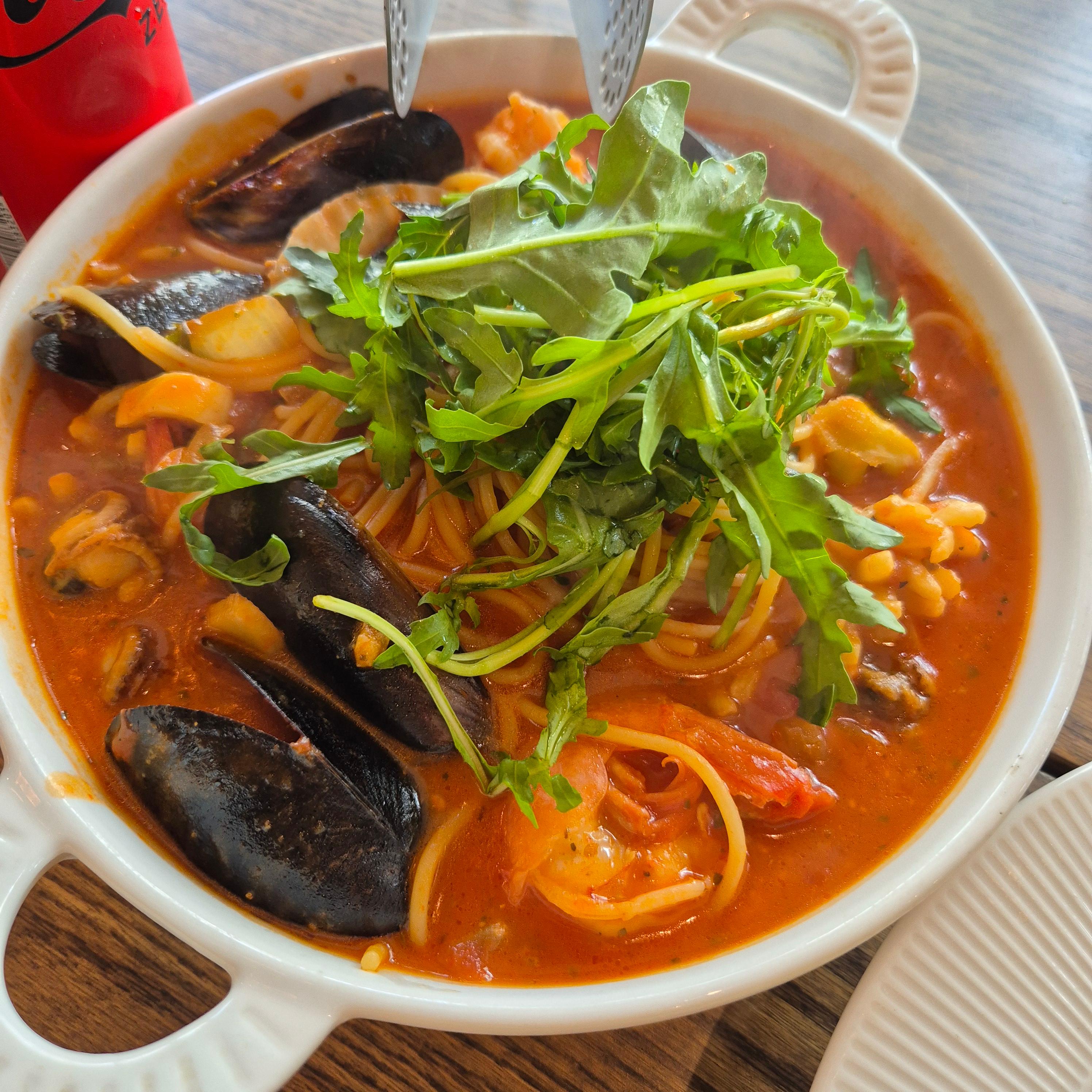- 스파이시 뻬쉐 파스타 (뚝배기 스타일) – 얼큰·시원한 국물 맛으로 인기.