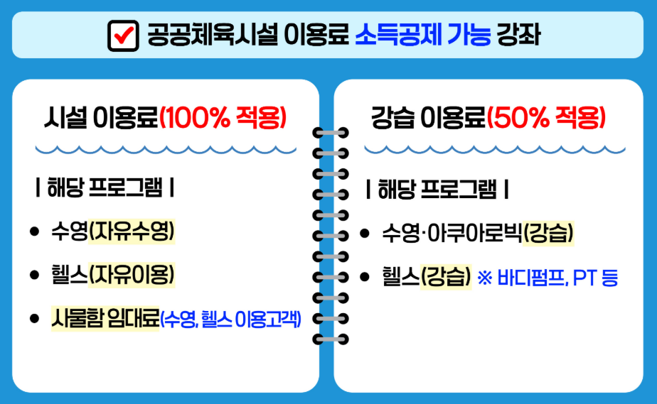 👉 즉, 이제는 구립 체육센터, 시립 수영장, 주민운동시설 등 공공체육시설 이용료도 소득공제 대상이 됩니다.