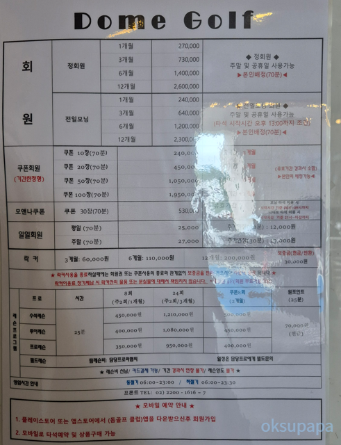 왕십리 돔골프는 **중·상급 연습장 대비 합리적인 가격대(평일 25,000원 / 주말 27,000원)**에,