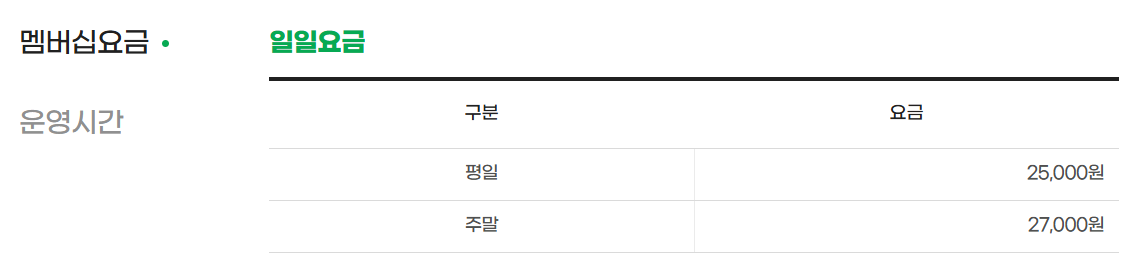 | 일일 타석 요금 | 평일 25,000원 | 주말 27,000원 |