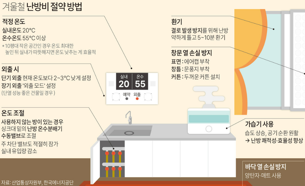 - 밤에는 난방 온도 낮추고 두꺼운 이불·실내 복장 활용