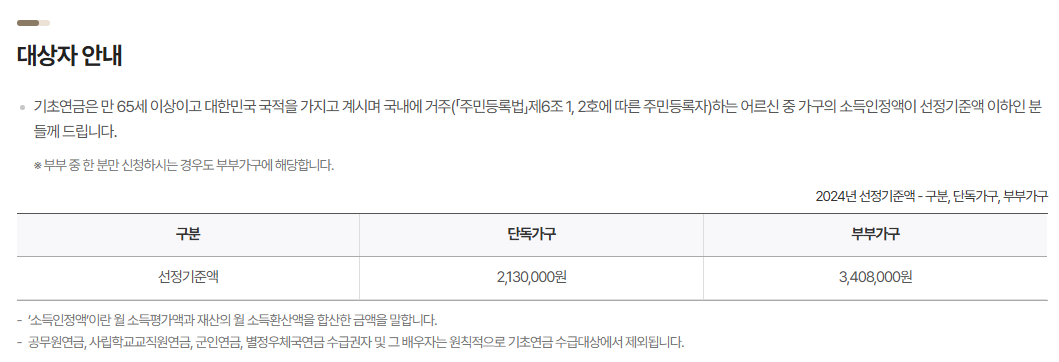 기초연금은 대한민국 국적을 보유하고 국내에 거주하는 만 65세 이상의 어르신 중 소득과 재산이 일정 기준 이하인 분들에게 지급됩니다. 대상 선정 시 소득인정액을 기준으로 심사하며, 소득인정액은 월 소득과 재산을 소득으로 환산한 금액을 합산하여 산정됩니다.